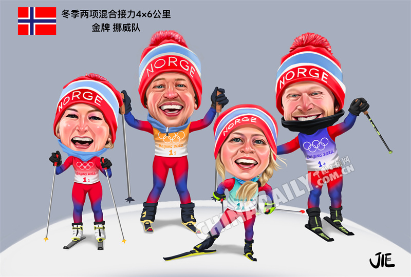 2月5日 冬季两项4×6公里混合接力: 挪威队(马特·奥尔斯布·雷塞兰、塔尔耶伊·伯厄、特丽尔·埃克霍夫、约翰内斯·廷内斯·伯厄)--绘画:李永杰