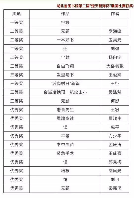 2015年9月7日,由湖北省图书馆主办,湖北省新闻漫画研究会协办的第二届“楚天智海杯”全国漫画比赛征集作品评审会在湖北省图书馆七楼会议室举行。