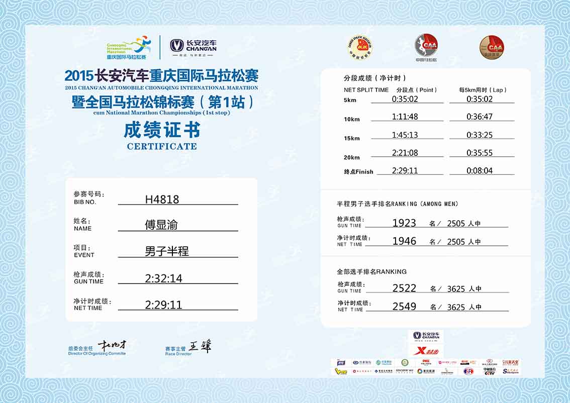 前日参加了重庆国际马拉松赛的半程赛,用时2小时29分11秒跑完21公里。赛前两月内仅练习了跑步十来次,大多仅跑了5公里,另跑了三次7公里、一次10公里。年过六旬有生以来第一次跑如此长的距离,对我来说是一次极大的挑战,最后三公里感到已抬不起脚,但凭着三十多年前跑过几年长跑及坚持了二十年冬泳的打下的基础,还是咬紧牙关坚持跑到了终点! 本贴最后由 abc126709 于 2015-03-26 23:54 编辑过。