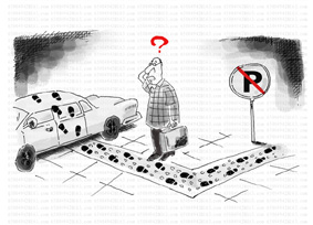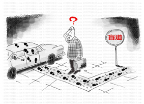 做了一幅漫画 恐没人明白的图中所表之意 遂想二法, 一为 直截了当 加之"盲道" 一为 禁停标志 烦请大家评一下,哪个表意确切明了,谢过