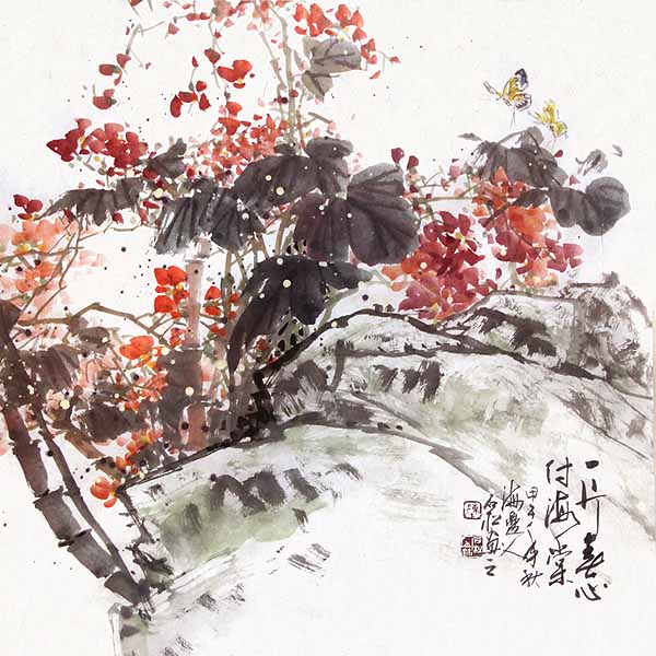 海边人国画《一片春心付海棠》,图画无诗,画题有诗,故画题提升了画品。