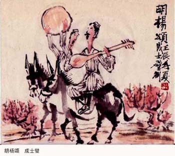 成教授的国画《胡杨颂》,笔墨简拙老到,练达酣畅,别具一格。味不在诗,味在笔墨。味,在中国艺术审美价值上,很独特。言尽而味无穷,真是语言难以表达的哟。前画《冰清玉洁人一双》,还不能以“笔墨”言之,故将成先生的画呈于此。