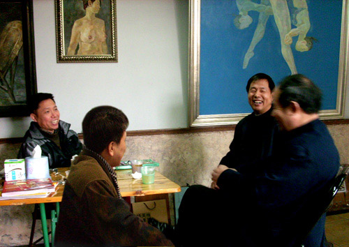 李二保、赵晓苏两位老师在欣赏油老师的新作品。
