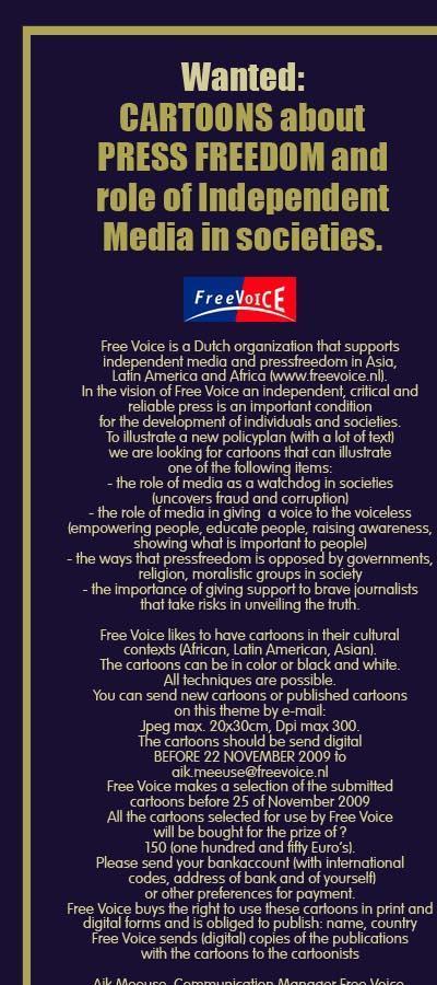 The organisers retain the right to publish or exhibit any of the cartoons submitted, but undertake to give due credit to the artists and ensure they receive any royalties/payments that may accrue as a result.