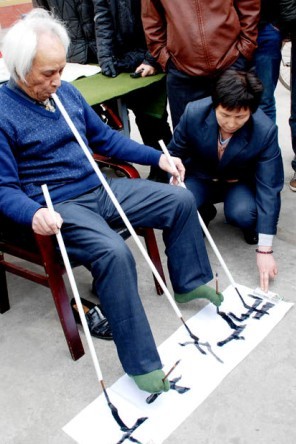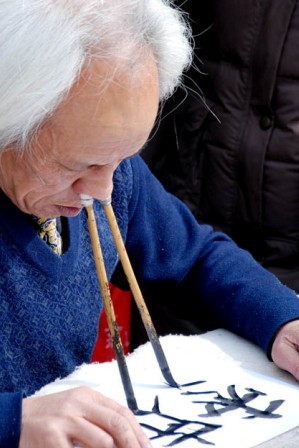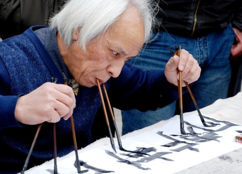 湖南书法家周命迪在山东枣庄表演“八管齐书”。
