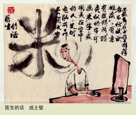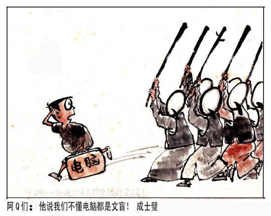 谢违先生鼓励,违先生说得对,我是搞预防医学专业的,画画是我的爱好,想画什么就画什么,没任何顾虑和条框限制。漫画水墨画是很萧洒的亊,我把它当成最好休闲内容之一,可舒缓心情,预防痴呆。。。是有益健康和延年益寿的方子,很有效!目前搞水墨画的多限制在花鸟鱼虫和飲酒品茶等小品方面,很少用来创作时政.新闻及重大题材的漫画,但我们的水墨前辈却不是这样。。。应该向他们学习!我这些玩艺完全没章法,仅是自已摸索和瞎画。 本贴最后由 CSB 于 2012-06-30 21:52 编辑过。