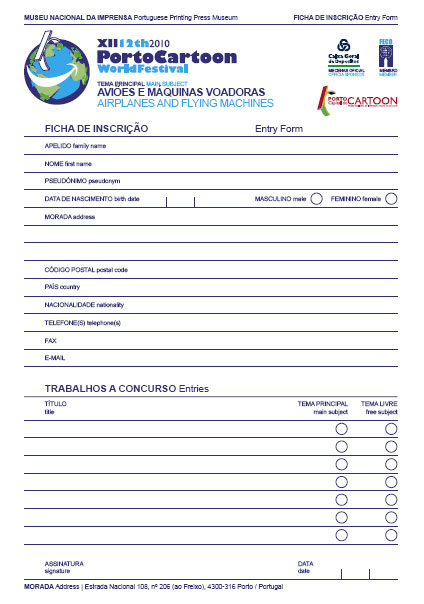 -The works should arrive at the PORTUGUESE PRINTING PRESS MUSEUM until 28/2/2010, with the entry form. The participation in PORTOCARTOON means automatically that the author is waving copyrights of his works in anykind of support (including web pages), concerning the production and diffusion of the festival.