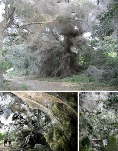 在美国得克萨斯州北部公园,来自12个不同种类的数千只蜘蛛一起纳成了这个巨大的网,它的跨度超过600英尺(约182米)。通常情况下,蜘蛛会争夺领地和食物,喜欢吃掉它们的敌人,各自建造独立的“网国”。成千上万的蜘蛛齐心协力红织出这么大的一个网,是十分罕见的。创纪录的降雨为它们提供了大量可食用的昆虫,蜘蛛们也就可以暂时停止内斗,一起织网了。更令人不可思议的是,这些蜘蛛并不是只在一个地方织了一个网。在第一个网被风雨破坏后,它们接连又织了两个网。