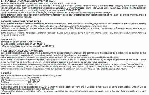 The rewarded relation will be published on the occasion of the solemnity of opening of the Contest. The selected and rewarded relation will be published on DOPA (Diario Oficial de Porto Alegre). About the Judging Committee that judge the presented Works, in reason of not presenting what was requested, there will be able a administrative resource of 05 (five) week-days, with protocol of the Graphic Art Coordination.
