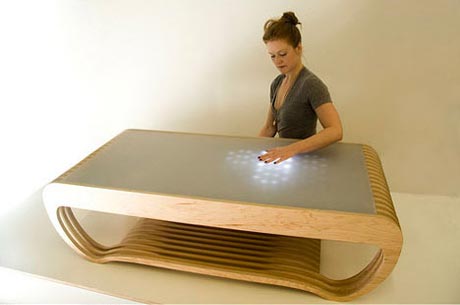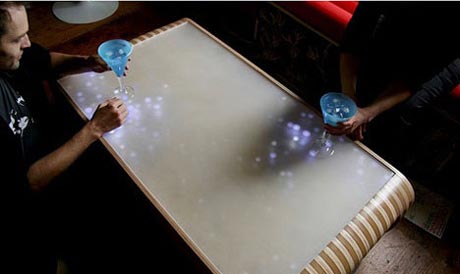 把480个Led灯及光学感应器嵌在桌子里面, 只要你轻轻触碰到桌面,就如水面一样,会泛起led灯的涟漪效果,非常棒的效果。
