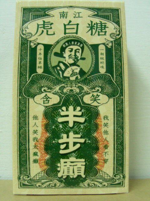 而在“含笑半步颠”糖的背面更写着:“传说中的含笑半步颠,是以蜂蜜、川贝、桔梗、加上天山雪莲配制而成。今人糖白虎改以跳跳巧克力取而代之,不需冷藏,也没有防腐剂。除了生性猛烈之外,味道还很好吃!实在是居家旅行,整人自娱,必备良品!”——这段产品解释更是与《唐伯虎点秋香》中的台词不谋而合。