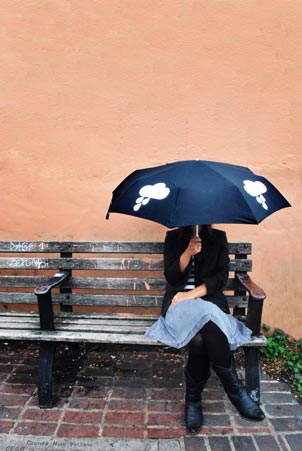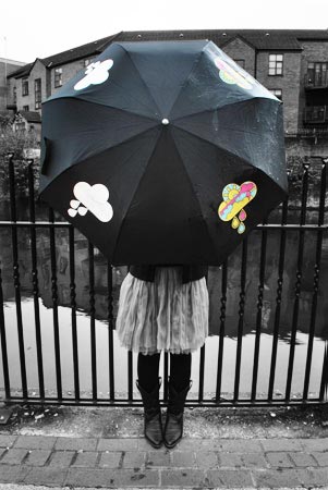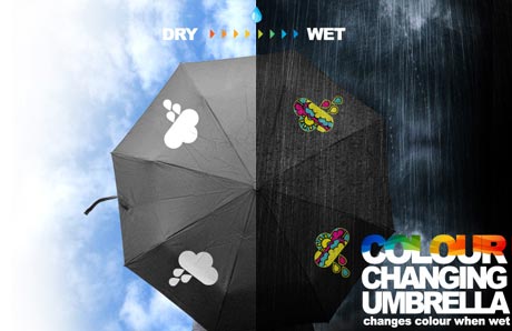 由SUCK UK 公司推出的这把伞蛮有意思的。在晴朗、干燥的日子,伞呈现的是白色的云朵,而在下雨天,白云就变成了彩色的图案。这是由于伞上的图案是印有特殊的油墨,而在遇水时,产生化学反应,于是图案就变成了彩色的。