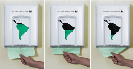 这个公共厕所里的纸巾盒印着一个南美大陆的图形。盒内的绿色纸巾代表南美洲的热带雨林。当盒内的纸巾被慢慢的抽出时,我们将看到绿色部分在南美大陆的图形上慢慢减少。这代表着一次性纸巾对南美大陆热带雨林造成的恶劣影响。