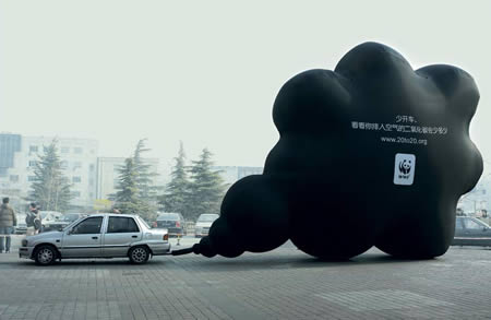 一个巨型黑云状的大气球连接在车的排气管上,并用车子一天排出的尾气来充满气球。黑云状气球上写着,“如果你一天不开车的话,看看我们呼吸的空气中能少排放多少一氧化碳。”
