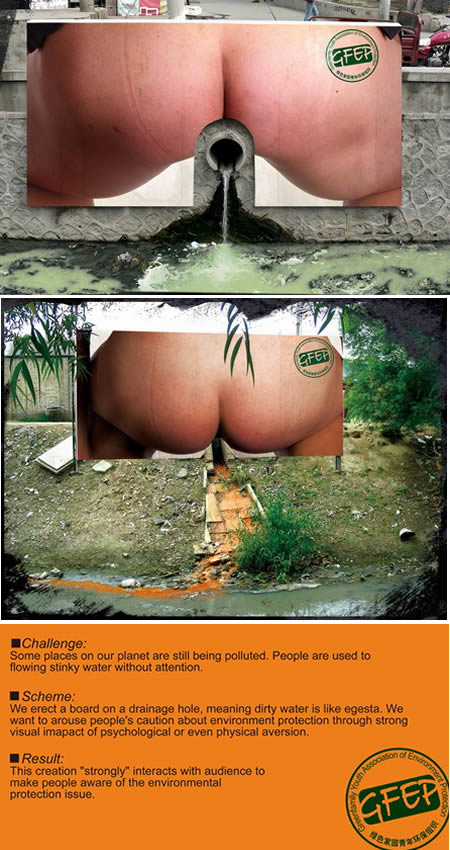这则广告是由“绿色家庭——环保青年联合会”用来提醒人们不要污染环境的。把一个人的屁股做成的牌子立在排水管道口的上面,意思是,污水就像是排泄物一样。他们想用强烈的视觉冲击来引起人们生理和身体上的反感,以此来引起人们对环境保护的注意。