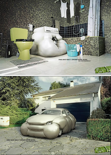 这是比利时联邦气候变化研究部门、联邦大众健康服务部门、食品安全部门和环保部门联合推出的广告。其广告语是:“在购买之前,想想他们会消耗什么?”通过滑稽的手法将电器和收音机等巨型化,将人们的注意力吸引到一个可以计算电器消耗的网站上。
