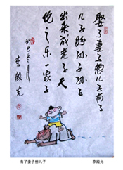 李建国这件作品,如果要从形神上说,并无可取。漫画也是要讲究“形神兼备”的,只不过漫画的形神兼备的具体形态与国画油画不同而已,具体说,漫画造型要夸张得美,人物情态要夸张得淋漓尽致。李建国这两点都做得不够。但是,我赞同评委仍然要发5000大洋鼓励。