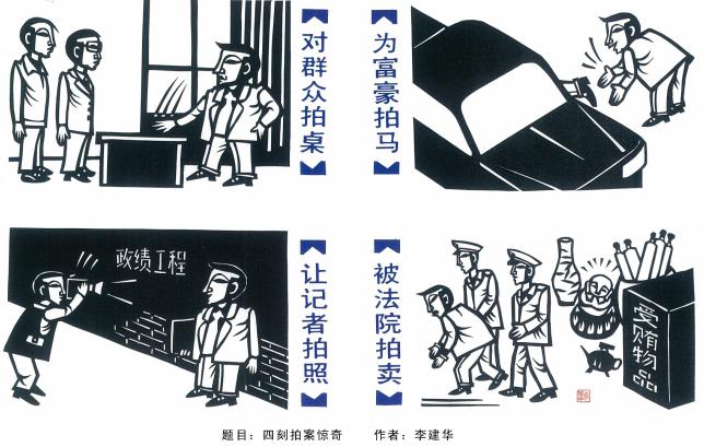 鼓励什么?鼓励漫画要讲究文学性。从题目看,有借典化用出巧生趣之意。这个用典是借明代著名传奇话本短篇小说集《初刻拍案惊奇》和《二刻拍案惊奇》,李建国自己来续作《四刻拍案惊奇》。画中四“拍”,很能够与“四刻拍案惊奇”切题,颇得生趣。《初刻拍案惊奇》和《二刻拍案惊奇》与《喻世明言》、《警世通言》、《醒世恒言》合称“三言二拍”,意义在于喻世、警世、醒世。李建国的漫画,内容讽刺,其实也在喻世、警世、醒世。