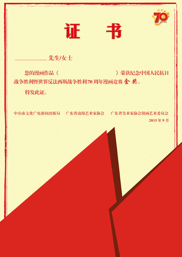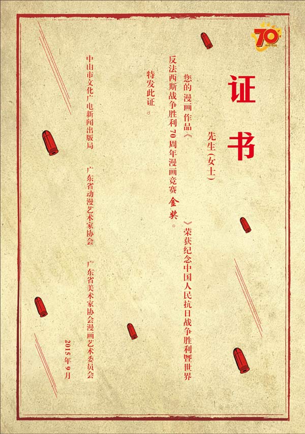 内容文字改为:您的作品---入选(或参加了)纪念中国人民抗日战争胜利暨世界反法西斯战争胜利70周年漫画展览,并荣获金奖。