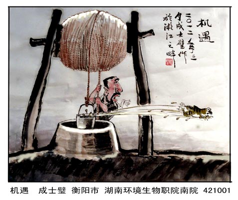 我最喜欢《机遇》这件作品,百读不厌!我初涉水墨漫画之时,有幸拜读欣赏到这件大作,从某种意义上讲,此作给了我创作的启迪!