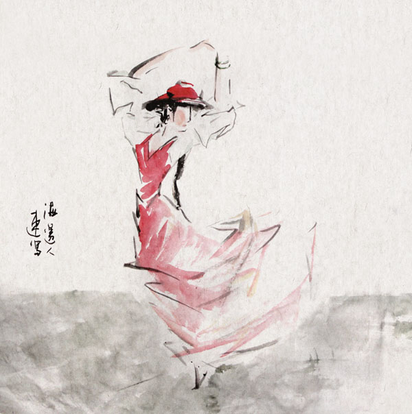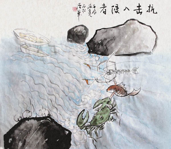 水墨小品-人往下游漂,鱼往船里跳。陕西全国漂流漫赛三等奖。
