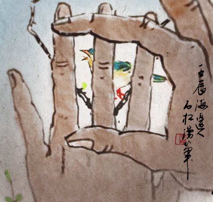 ,哈,海边人,我也喝你撞了哈。但不同的是我手组成的笼子里是大动物哈,手是直接用手掌蘸墨印的哈,而且作品正在画着哈,呵呵,你先画了我就不画了哈!