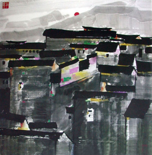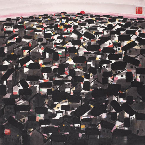 学理的水墨越来越美.我曾经贴上-件画有红太阳像个曰本膏药的作品,后来海边人也贴上-件画有太阳的作品,他无语,我一对照恍然大悟,真乃此处无声胜有声.
